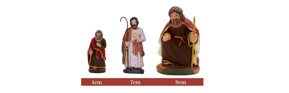 Les santons de Provence artisanaux sont fabriqués en argile et peints à la main. Ils existent en plusieurs tailles standardisées qui varient selon les santonniers. Chez Santons Richard, artisan créateur depuis 1966, nous proposons principalement trois formats : les santons 4 cm, les santons 7 cm et les santons 9 cm.